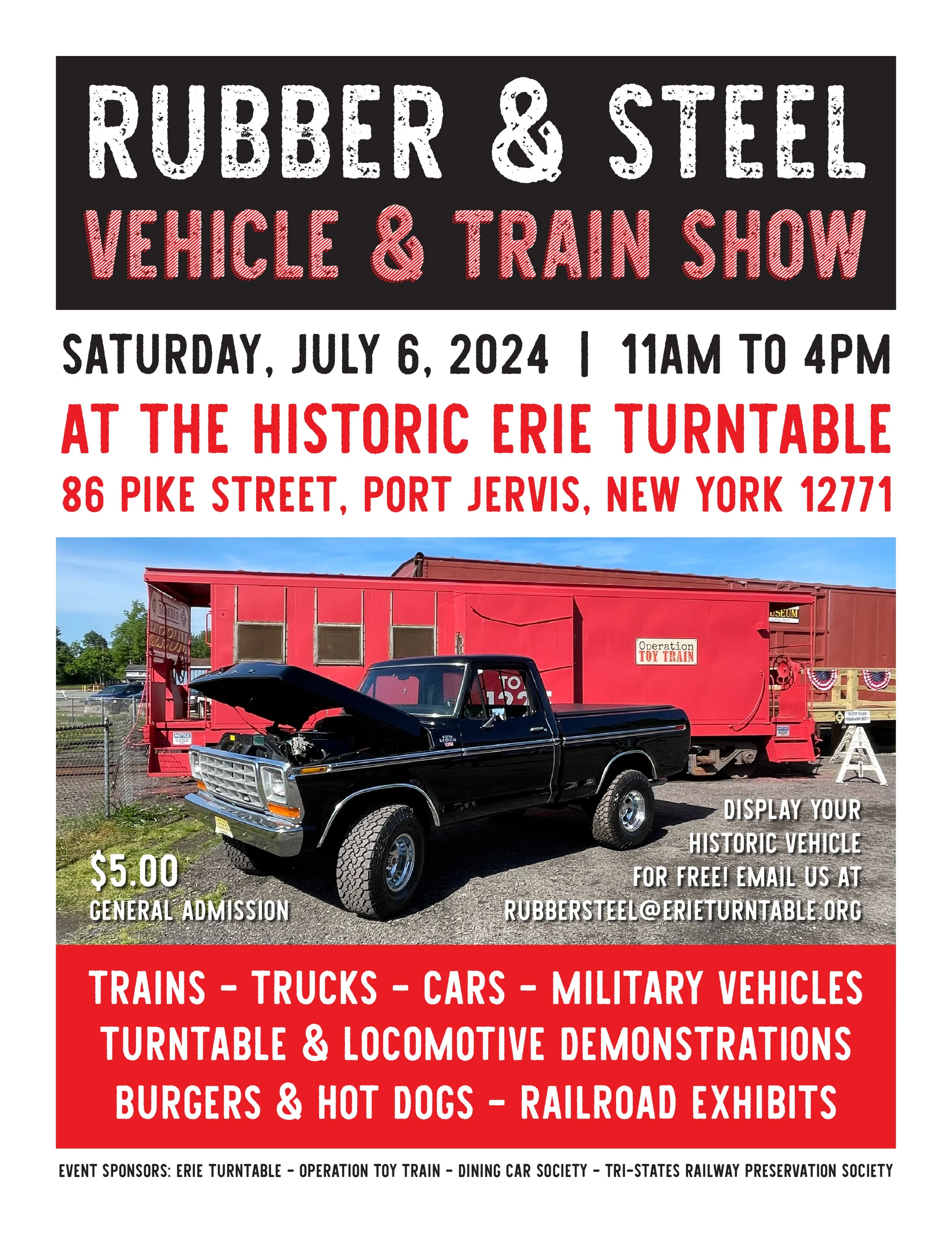 Operation Toy Train, the Dining Car Society, and the Tri-States Railway Preservation Society have partnered for the 2nd annual Rubber & Steel Vehicle & Train Show at the Erie Turntable!